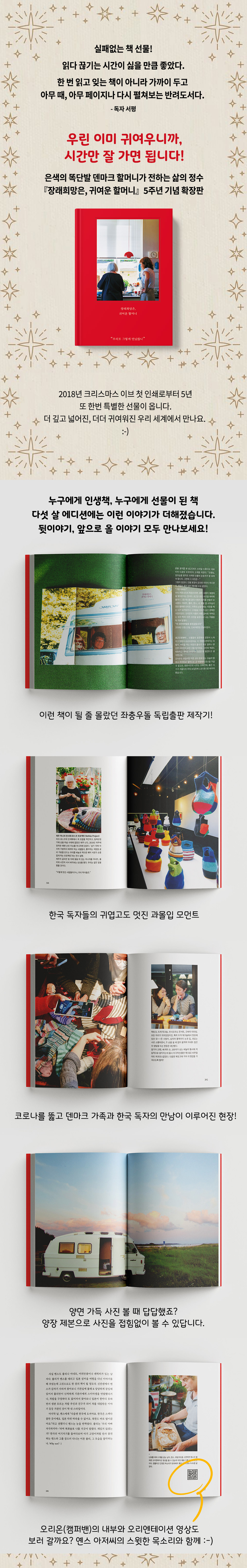 그리고 2023년 크리스마스 이브에 첫 인쇄 5주년을 맞아 특별한 책이 출간된다. 이 귀여운 책을 둘러싼 공간과 시간, 사람 들의 이야기를 수집한 <5주년 기념 확장판>이 그것이다. 사진집을 만들려고 했는데 엉뚱하게 에세이가 된 사연, 저자의 꾀임에 넘어가 소중한 연말에 책 작업에 동원된 친구들, 지금과 전혀 다른 표지가 될 뻔했던 과정, “이렇게 멋진 사람들이구나"라고 감탄하게 만든 우리 독자들의 이야기가 원래 있던 이야기에 더해져 책은 한껏 풍성해졌다. “다 읽어버리는 게 아까워 한 장 한 장 아껴 읽었다”는 독자들의 안타까움은 이제 사라질지도? 아니면 앞으로 또 어떤 사람의 어떤 이야기가 더해질까 궁금해 10주년 기념판이 벌써부터 기다려질지도!